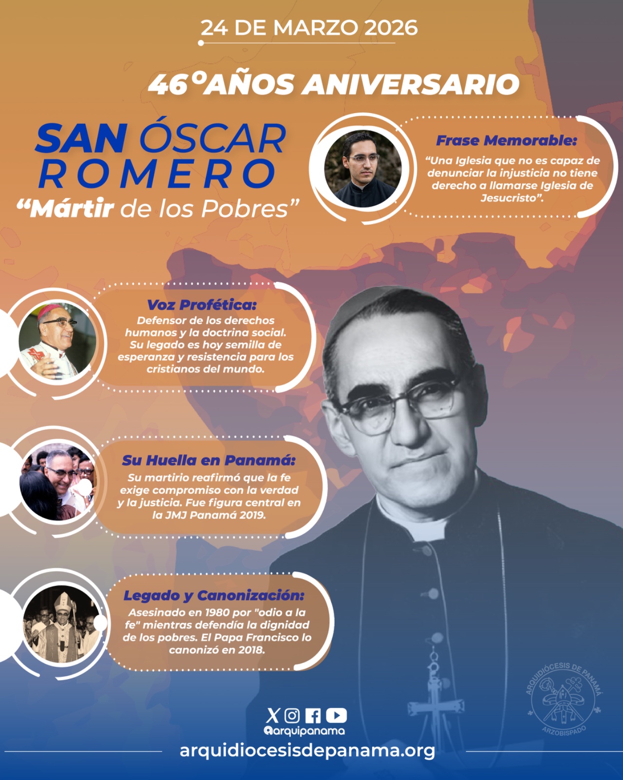 La vida, el testimonio y el martirio de San Óscar Arnulfo Romero, a 46 años de su asesinato, resplandece como un faro de evangelización y santidad pastoral en medio de las complejas realidades sociales y eclesiales del continente. Su figura continúa iluminando el camino de la Iglesia en América Latina y en particular mantiene una conexión profunda con Panamá, especialmente en su firme compromiso con la justicia y la defensa de la dignidad humana.